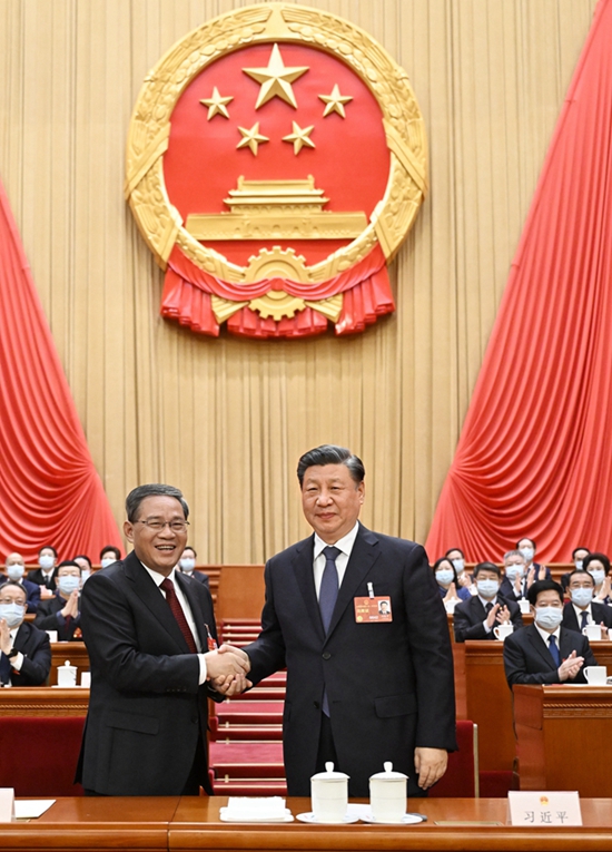 第14期全國(guó)人民代表大會(huì)(全人代)第1回會(huì)議の第4回全體會(huì)議が11日に行なわれ、習(xí)近平國(guó)家主席の推薦に基づき、投票を経て、李強(qiáng)氏が中華人民共和國(guó)國(guó)務(wù)院総理となることが決定した。寫真は李克強(qiáng)氏と握手をする李強(qiáng)氏?!?/p>