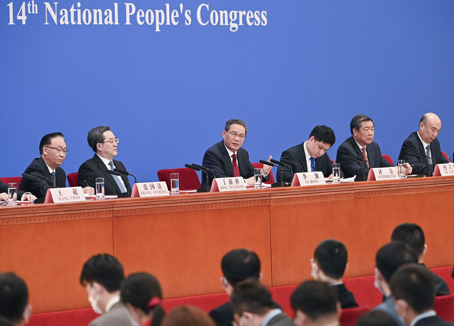 第14期全國(guó)人民代表大會(huì)(全人代)第1回會(huì)議が13日午前に閉幕し、李強(qiáng)國(guó)務(wù)院総理が人民大會(huì)堂3階の金色大庁(ゴールデンホール)で総理記者會(huì)見に臨み、國(guó)內(nèi)外の記者の質(zhì)問(wèn)に回答した?!?/p>