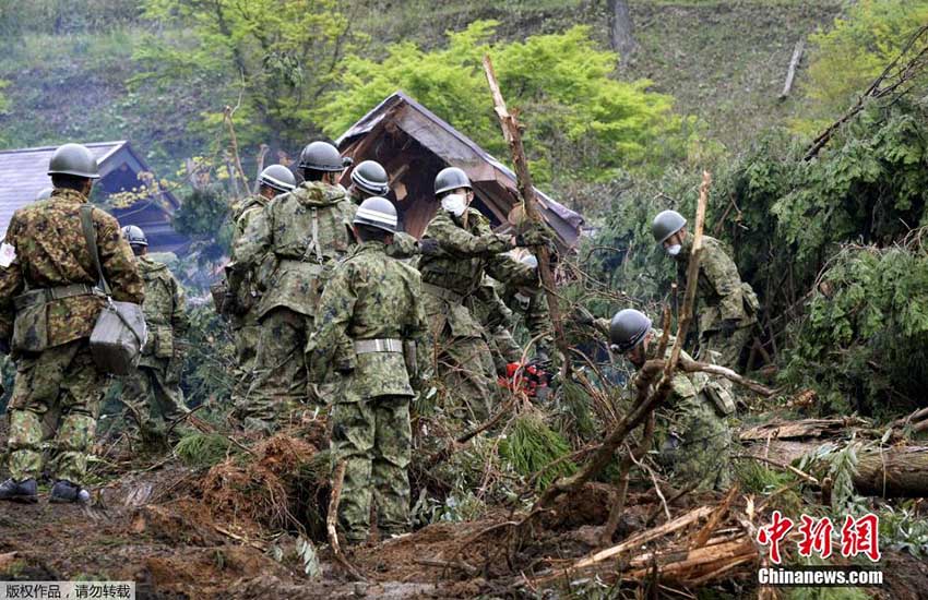 日本の自衛(wèi)隊員が熊本地震の被災(zāi)地で現(xiàn)地時間の4月18日、救援活動を行っている。[詳細(xì)]
