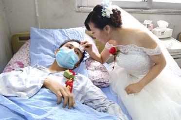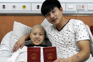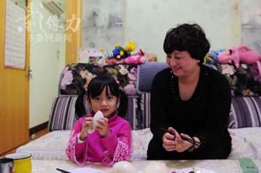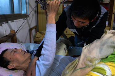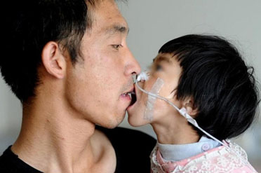 山西省児童病院の病室では21日、娘に口移しで食事を與える王志華さんの姿が見られた。父親がまだ咀嚼し終わらないうちに大きな口を開ける娘は、まるで餌を待っているひな鳥のようだ
