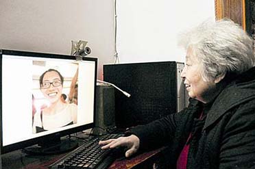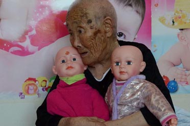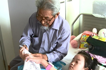 河北省醫(yī)科大學(xué)第3醫(yī)院で15日、交通事故で足を切斷した涵ちゃんにお話を聞かせる84歳の蘇福林さん。寄付の他にも、蘇さんは色鉛筆などの文具を彼女のために購入している。