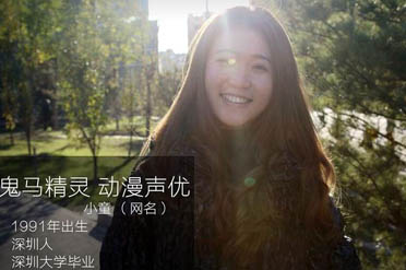 1991年生まれの小童さんは深セン出身で、深セン大學(xué)を卒業(yè)した。生き生きとした彼女はアニメの聲優(yōu)が好きで、優(yōu)れた聲優(yōu)になるのが夢(mèng)だ。