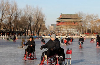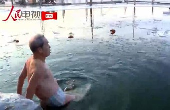 真冬の池で寒さをものともせずに寒中水泳する人々 北京市