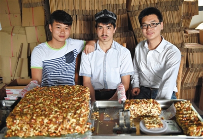 | 22日、「淘寶網(wǎng)」で販売する「切糕」を作る阿迪力さん(真ん中)、蔣金亜さん(右)、蔣春楊さん。 |