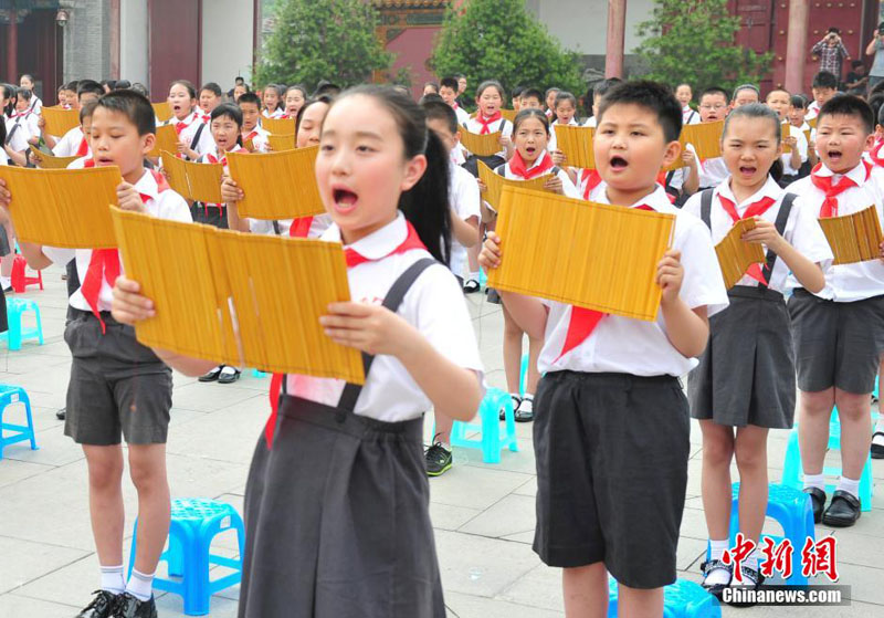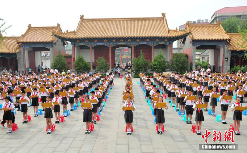 寫真は25日、孔子の「論語」を朗読する小學(xué)生?!钢腥Aの調(diào)和·第5回海峽両岸古典文化普及合同公演」が同日、済南府學(xué)文廟で行なわれた。孔子の第79代目の子孫で臺灣地區(qū)の「中華大成至聖先師孔子協(xié)會」會長、孔垂長氏及び中國大陸部と臺灣から小學(xué)生300人以上が參加して孔子の「論語」を朗読し、共に中華の優(yōu)れた伝統(tǒng)文化の継承を行った?!钢腥Aの調(diào)和·第5回海峽両岸古典文化普及合同公演」は済南市、臺中市、廈門市、福州市、香港、澳門(マカオ)などで同時に開催され、中國大陸部と臺灣から5萬人以上が參加した。中國新聞網(wǎng)が伝えた。(編集YH)
