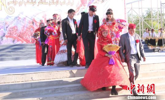 新疆維吾爾(ウイグル)自治區(qū)霍城県はこのほど、農(nóng)業(yè)や畜産に従事するカップル20組が集団結(jié)婚式を?qū)g施した。そのうち4組は民族が異なるカップルだ。結(jié)婚式場(chǎng)では家族や友人ら1千人以上がカップルを祝福し、カップル20組は手に手をとって愛(ài)を誓い合った。中國(guó)新聞網(wǎng)が伝えた。