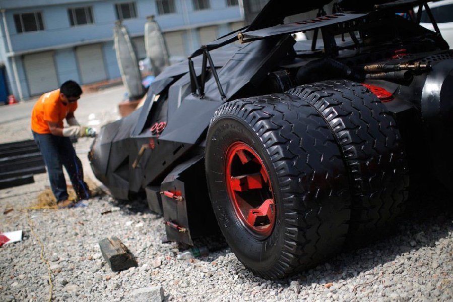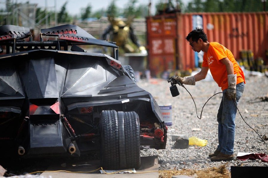 寫真は上海で5月30日、「バットモービル」を塗裝する自動車修理工。持ち主の李偉磊さんは余暇の時間を利用してこの「バットモービル」を作った。総額7萬5千元(約123萬円)を費やしたこの車は前輪が一般の車の倍の幅があり、4つの後輪は人の背の半分ほどの高さで、車の底は地面すれすれの高さだ。新華網(wǎng)が伝えた。