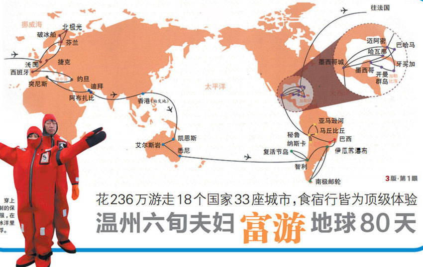 浙江省溫州市に住むの陳通明さん(62)は今年2月4日、妻と2人で総額236萬(wàn)元(約3870萬(wàn)円)の世界一周旅行に出発した。ツアー客は陳さん夫婦と付き添いのガイド2人の、計(jì)4人のみだ。80日の世界一周旅行で、陳さん夫婦は18の國(guó)と33都市を訪れた。