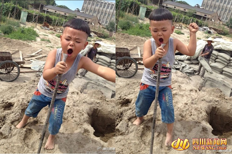 鉄筋を持って工事現(xiàn)場(chǎng)でわれを忘れて歌を歌う子どもが4日、「人民日?qǐng)?bào)」など多くの微博(ウェイボー)で話題を集めている。微博の寫真によると、子どもは小さな體を大きく動(dòng)かしてポーズをとり、プロのロック歌手のような様子がインターネット利用者から「可愛い」、「格好いい」と評(píng)判を集め、また「工事現(xiàn)場(chǎng)の歌の王者」と呼ばれている。4日午後4時(shí)までに同微博は2萬(wàn)5315回転載された。四川新聞網(wǎng)が伝えた。