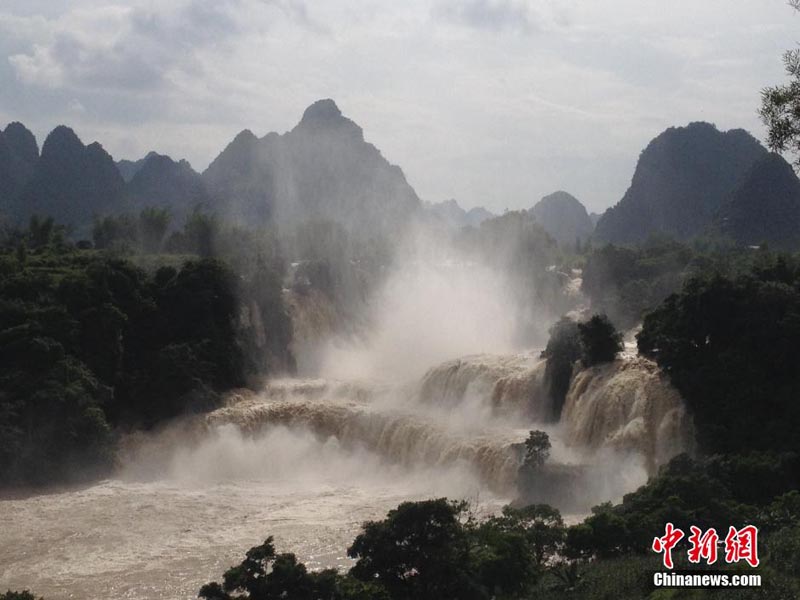 中國(guó)とベトナムの國(guó)境に位置する広西壯(チワン)族自治區(qū)崇左市は9日午後、突然の豪雨にみまわれ、中國(guó)?ベトナム両國(guó)にまたがる徳天瀑布では水の勢(shì)いが急に強(qiáng)くなった。徳天瀑布は世界第4、アジア一の國(guó)境にまたがる瀑布だ。中國(guó)新聞網(wǎng)が伝えた。(編集YH)