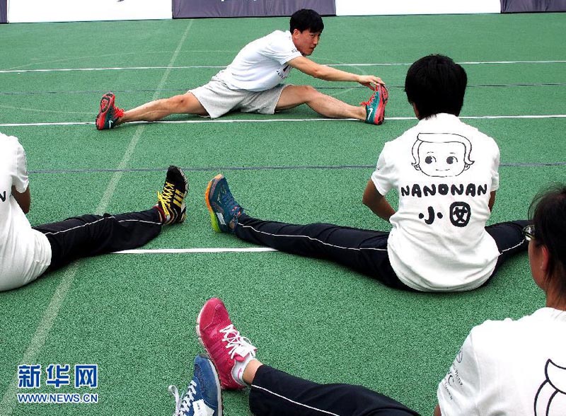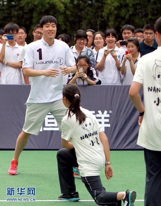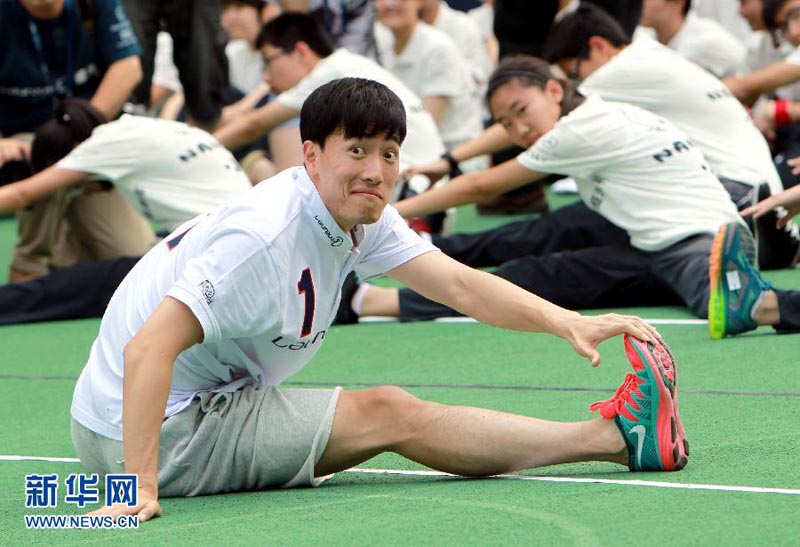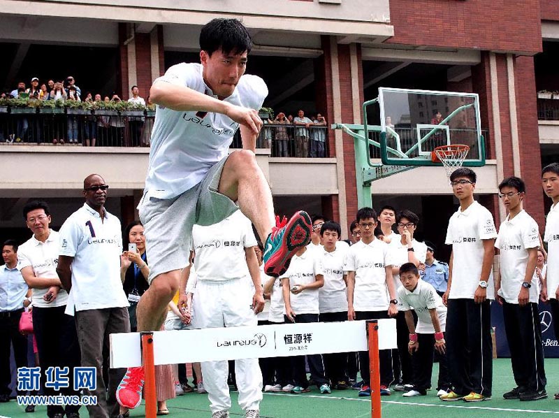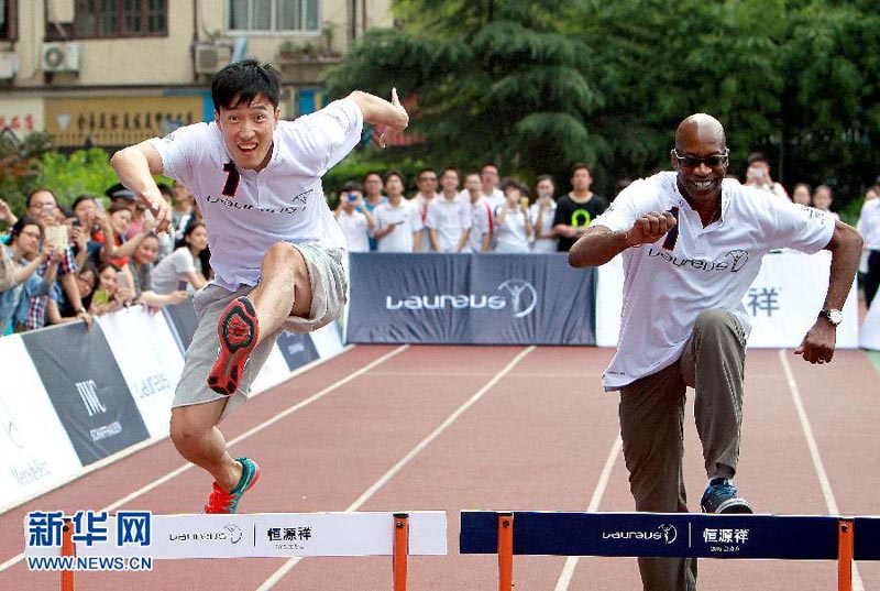 寫真は9日、ハードルの実演を披露する劉翔選手(左)とモーゼス氏。劉翔選手と「ローレウス?ワールド?スポーツ?アカデミー」のエドウィン?モーゼス會長は同日、上海格致中學(xué)を訪れて中高生向けに體育の授業(yè)を行い、ハードルのテクニックを伝授した。新華網(wǎng)が伝えた。(編集YH)
