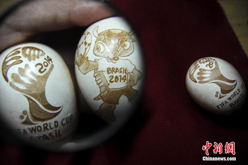 安徽省合肥に住む無形文化遺産の卵の殻の彫刻の継承者、王剣さんは1週間かけて、高さ約6センチ、幅4センチの2つの卵の上にサッカー?ワールドカップ(W杯)2014年ブラジル大會のオフィシャルマスコット「フレコ(Fuleco)」とブラジル大會のマークを彫刻し、もうじき開催されるW杯を迎えようとしている。寫真は9日、卵の殻の彫刻。中國新聞網(wǎng)が伝えた。(編集YH)