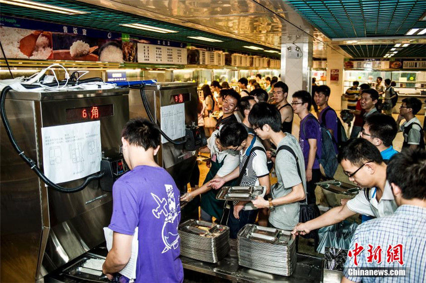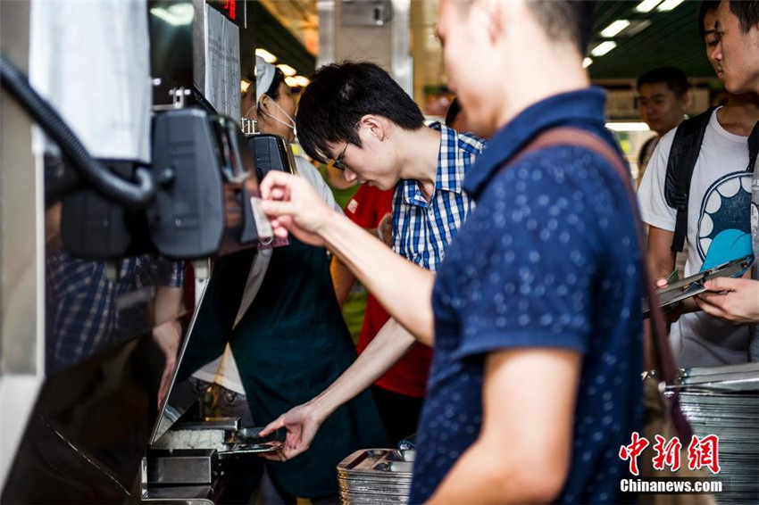 寫真は広州華南理工大學(xué)のある食堂で11日、新たに設(shè)置されたご飯の自動(dòng)配膳機(jī)を使う學(xué)生たち。同大學(xué)の食堂ではこのほど、新たに購入したご飯の自動(dòng)配膳機(jī)2臺(tái)が稼動(dòng)した。學(xué)生は指示に従ってトレイを置いてカードを通すだけで、機(jī)械が自動(dòng)的に分量どおりのご飯を配膳してくれる。中國新聞網(wǎng)が伝えた。(編集YH)
