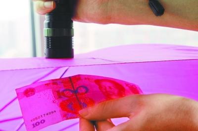 まず、紫外線照射燈で100元札を照らすと、緑色の蛍光塗料で書かれた「100」の字がはっきり見える。次に、普通の雨傘を用意し、雨傘の下に100元札を置き、雨傘を隔てて紫外線照射燈で100元札を照らした場合も、やはり「100」の字ははっきり見えた。