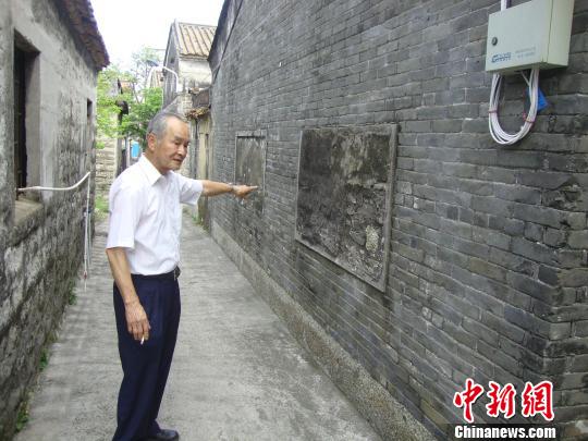 元慰安所を指さしながら、「この壁には、舊日本軍が作った窓があったが、1945年に日本が降伏した後、家の持ち主がレンガと石で窓を塞いだ」と説明する曾棠さん(83)。