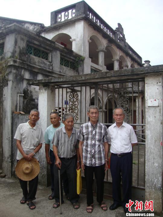 舊日本軍の臨時指揮部として使用された蓮塘村の洋館「就業(yè)堂」の前で、(左から)陳福炎さん(83)、譚添倫さん(83)、鐘泉さん(92)、譚振棠さん(87)、曾棠さん(83)。