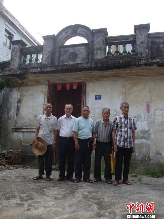 | 舊日本軍が、占領(lǐng)後に慰安婦用の宿舎?食堂?浴室に改造した蓮塘村の譚家舊家の前に立つ、(左から)陳福炎さん(83)、曾棠さん(83)、譚添倫さん(83)、鐘泉さん(92)、譚振棠さん(87)。 |