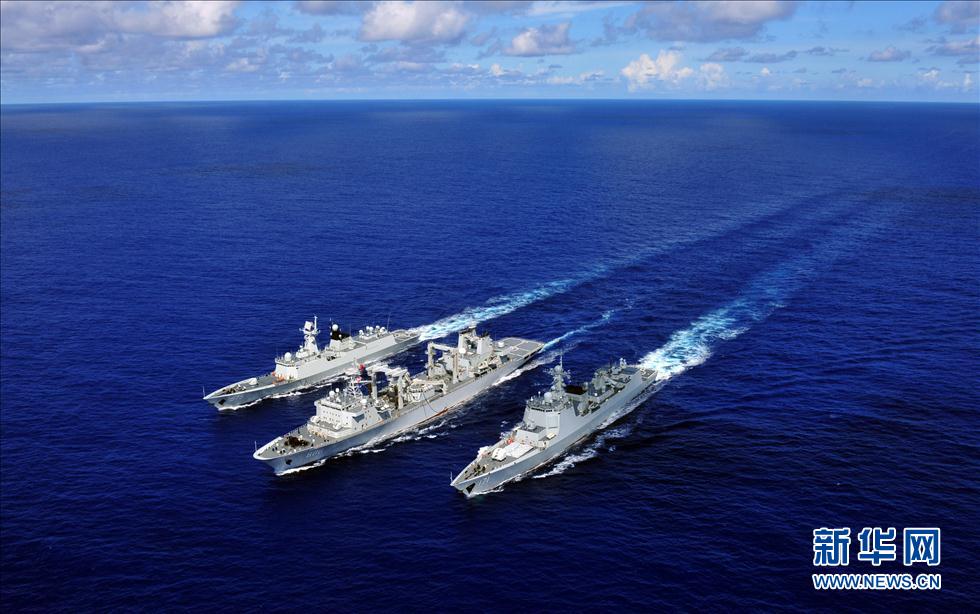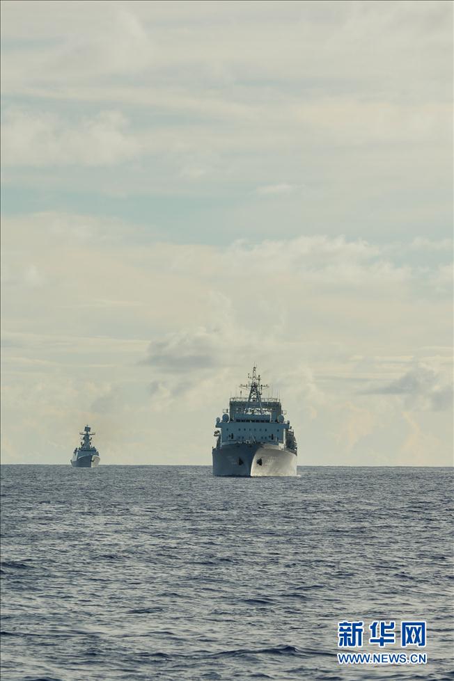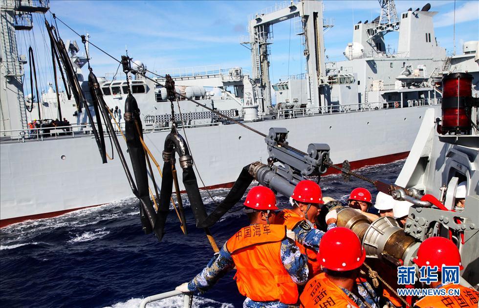 合同演習(xí)「リムパック2014」參加のため米國(guó)へ向かっている中國(guó)艦隊(duì)は現(xiàn)地時(shí)間13日午前7時(shí)頃、西太平洋海域で総合補(bǔ)給艦「千島湖」による「海口」「岳陽(yáng)」への最初の補(bǔ)給を行った。寫真:西太平洋海域で「海口」(右)と「岳陽(yáng)」(左)に海上補(bǔ)給を行う総合補(bǔ)給艦「千島湖」。(編集NA)