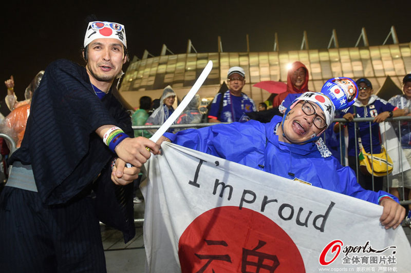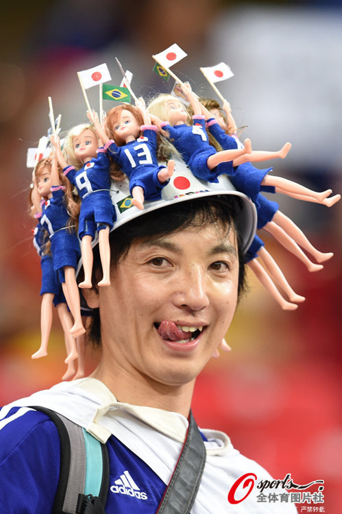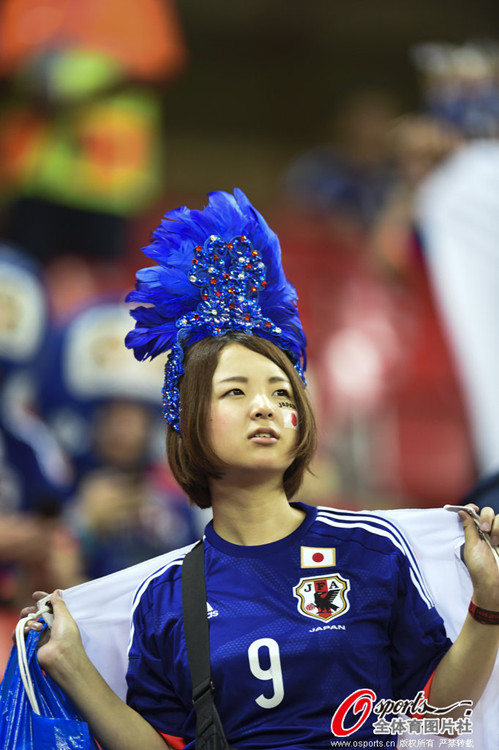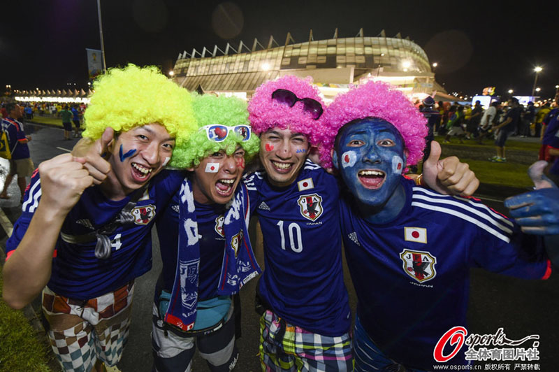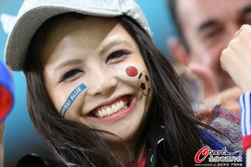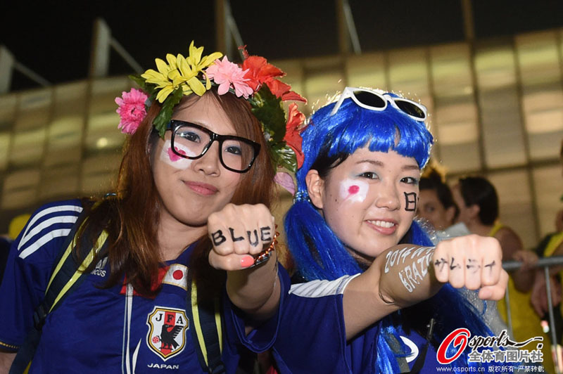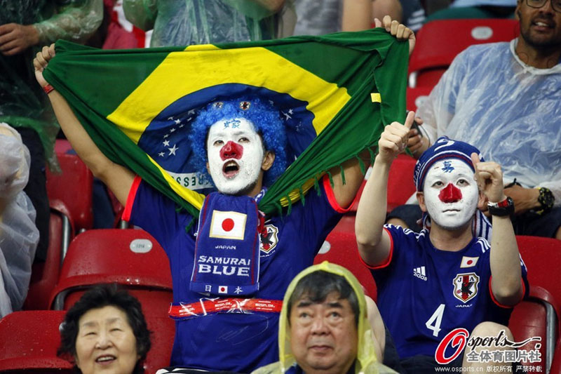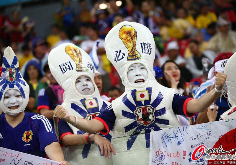 北京時間の15日、サッカー?ワールドカップ(W杯)2014ブラジル大會のグループC、日本対コートジボワールの試合を見るために、多くのファンが競技場に集まった。様々な獨特のファッションをしたファンたちは、競技場の選手たちに大きな聲援を送った。(Steven/Osports全體育伝媒の著作権作品。転載禁止)人民網(wǎng)が伝えた。(編集YH)