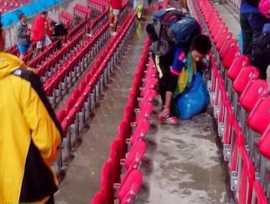 雨の中で試合後にゴミ拾いをする日本人 マナーある応援が好評(píng)