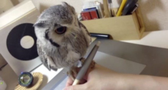 フクロウの飼い主の日本人はイラストレーターで、デジタル機(jī)器をよく使うものの、フクロウはそれでもお構(gòu)いなく飼い主の手の上でくつろいでいる。