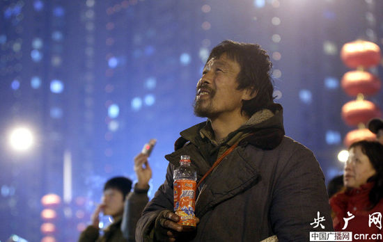 鄭州のCBD で2012年2月6日、拾ってきたペットボトルのお茶を飲みながら、空に上がる花火を見(jiàn)て笑顔を浮かべるホームレスの男性がいた。中國(guó)広播網(wǎng)が伝えた。