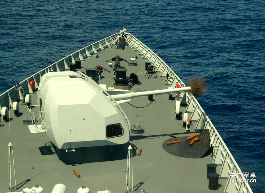 19日午後、ブルネイの巡視艦2隻、中國のミサイル駆逐艦「岳陽」とミサイル護衛(wèi)艦「??凇埂ⅴ伐螗荸`ルの護衛(wèi)艦、米國のミサイル駆逐艦は太平洋中部の広大な洋上で単列縦隊を組み、右前方約5500メートルの目標に対して主砲射撃を行った。ブルネイの巡視艦に続き「岳陽」と「??凇工鳌?0発の砲弾を発射し、特定の地點に割合集中して著弾した。射撃映像を分析した結(jié)果、両艦ともに目標に命中させたと判斷された。(編集NA)