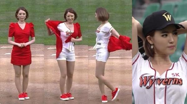 19日に行われた韓國のプロ野球の試合で、女子アナのヤン?ハンナが始球式を擔(dān)當(dāng)。マウンドで、赤のワンピースを脫いでユニホーム姿になり、男性ファンの目をくぎ付けにした。中國新聞網(wǎng)が臺灣の「今日新聞網(wǎng)」の記事を引用して報じた。