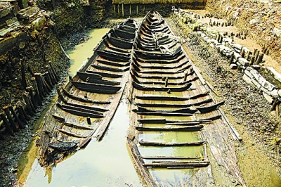 広州市文化広電新聞出版局の関係者は、「建設(shè)業(yè)者は同遺跡を発見後、自ら文化財(cái)管理部門に報(bào)告した。発掘作業(yè)は今年3月から開始されており、広州市文物考古研究院が擔(dān)當(dāng)している」と述べた。同研究院の研究員である易西兵氏は、「発掘作業(yè)は今も続けられており、現(xiàn)在までに3隻の船が発見された。いずれも木造船で、うち2隻の保存狀態(tài)が良好だ。最大の木造船は全長(zhǎng)が19.2メートル、船幅が3メートルに達(dá)し、高速船に屬する。土層位や出土した文化財(cái)を分析したところ、これらの船は清代中期?後期、つまり嘉慶?道光年間のものであることが判明した。船と同時(shí)に、磁器の破片や銅銭が見つかった。その年代は船よりも新しく、後になり混ざったものと考えられる」と指摘した。