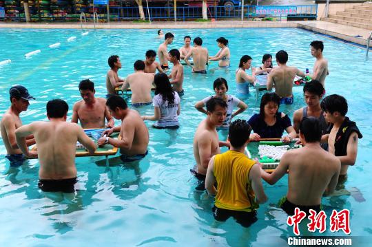 広東省仏山市三水區(qū)九道谷景勝地では24日午後、第1回水上麻雀大會(huì)が開催され、多くのマージャン愛好家が參加した。參加者は涼しいプールの中で麻雀を楽しむと同時(shí)に、水の涼しさも楽しんだ。中國(guó)新聞網(wǎng)が伝えた。(編集YH)