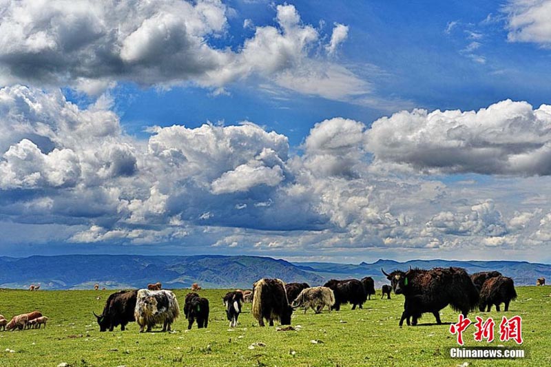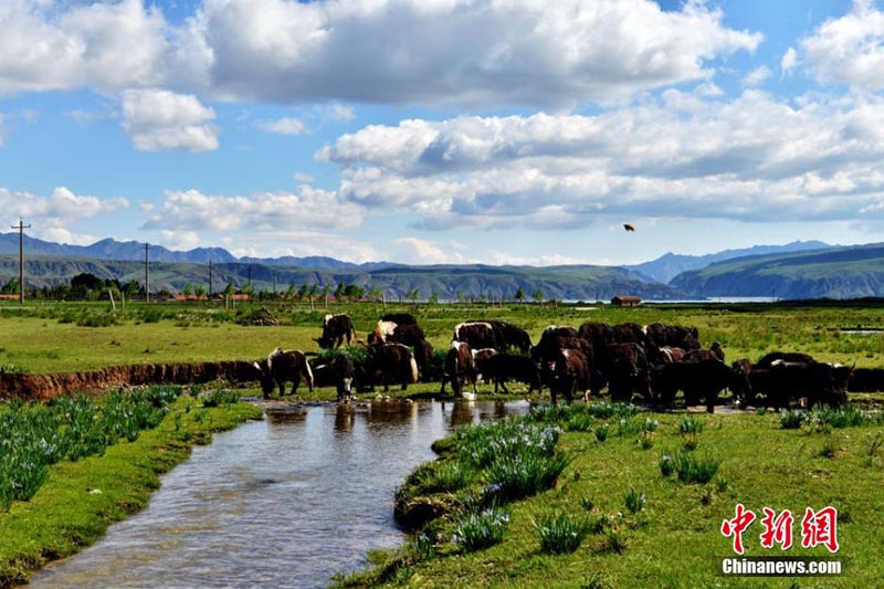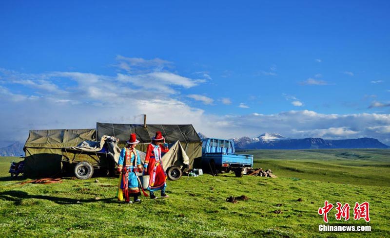 寫真は25日、祁連山の麓にある甘粛省粛南裕固族自治県で、夏の美しい風(fēng)景を見せる塔拉草原。雪山に緑の草木、湖、森からなる獨特な高地の草原は、青い空に白く聳える祁連山脈の雪山を遠(yuǎn)くに望み、また盛裝の裕固族の遊牧民が美しい風(fēng)景の中で働き、歌や踴りを楽しんでいる。中國新聞網(wǎng)が伝えた。(編集YH)