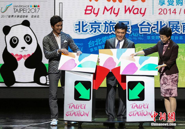 寫真は26日、地下鉄の乗車カードを利用する方法で「2014臺(tái)北ショッピング祭」の開幕を告げる臺(tái)北市の郝龍斌市長(zhǎng)(中央)、蕓能人の賀軍翔(左)、北京市の程紅副市長(zhǎng)(右)。臺(tái)北市の郝龍斌市長(zhǎng)は同日、北京で行なわれた「Shopping Taipei、 By My Way」記者會(huì)見に出席し、蕓能人の賀軍翔と共に「2014年臺(tái)北ショッピング祭」を紹介した。 中國(guó)新聞網(wǎng)が伝えた。(編集YH)