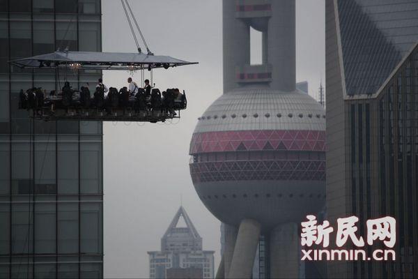 27日午前9時(shí)30分、定員22人の空中吊り下げレストランが小雨の中をゆっくりと上昇し始めた。場所は浦東四季酒店の屋外駐車場で、巨大なクレーン車につり上げられて上空に到著した。レストラン利用客はシートベルトでしっかり座席に固定され、細(xì)々とした持ち物は持ち込み禁止だ。食器が落下して下にいる人に當(dāng)たらないよう、クレーン車とレストラン下方の一帯は誰も入れないようになっていた。