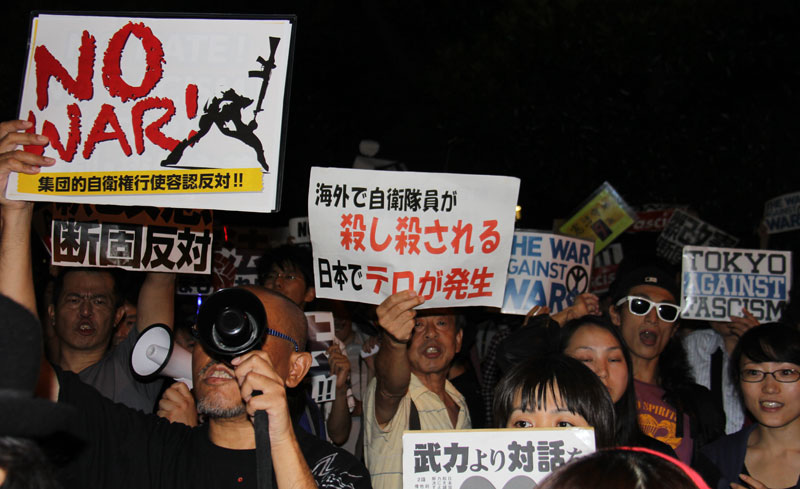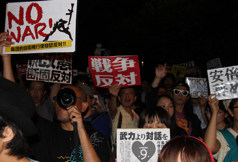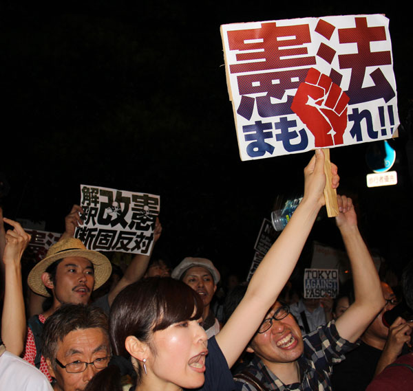 1日、首相官邸前では集団的自衛(wèi)権の行使容認に反対する日本の民衆(zhòng)の姿が絶えなかった。人民網(wǎng)記者が日本時間1日午後11時に首相官邸前を離れた時點でも、なお約2000人が「安倍退陣」「ファシズム反対」などのスローガンを叫んでいた。