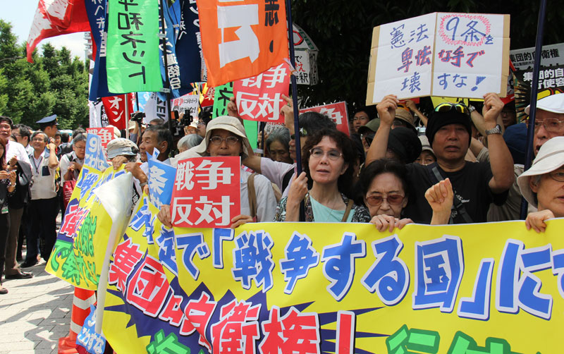 日本國憲法第9條は、日本は國権の発動たる戦爭と、武力による威嚇又は武力の行使は、國際紛爭を解決する手段としては、永久にこれを放棄すると定めている。日本政府は憲法9條の解釈として、これまで一貫して、自衛(wèi)権の行使は自國が直接攻撃を受けた後に反撃する「個別的自衛(wèi)権」に限られ、かつ日本に対する急迫不正の武力侵害があり、これを排除するために他の適當な手段がなく、武力行使の程度を「必要最小限度」にとどめるとの3要件を同時に満たすことが必要だとしてきた。この解釈に基づけば、日本は集団的自衛(wèi)権を行使してはならず、さもなくば憲法違反の疑いがあることになる。日本の少なからぬ憲法學者は、安倍內(nèi)閣の決定は平和主義の放棄であり、日本國憲法への違反、破壊であると考えている。