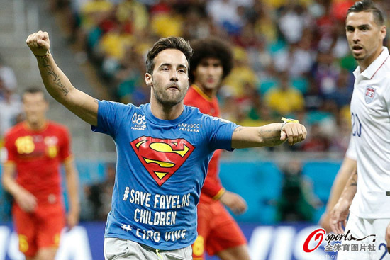 北京時(shí)間の2日早朝、サッカー?ワールドカップ(W杯)ブラジル大會(huì)の決勝トーナメントの試合で、ベルギーが米國(guó)と対戦した。しかし、試合開始後まもなく、スーパーマンの服裝をした「招かざる客」が試合を中斷させるハプニングがあった。人民網(wǎng)が伝えた。