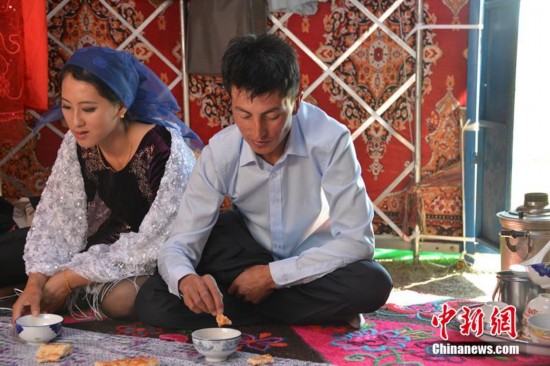 新郎側の両親はカザフ族の民族衣裝を新婦に贈り、また新婦の両親に対して汗血馬1頭と大小それぞれ1頭の牛を贈った。また新婦側家族の男性の親戚や友人にそれぞれカザフ族の帽子と馬用の鞭を、女性の親戚や友人にはカザフ族の布を贈った。(編集YH)