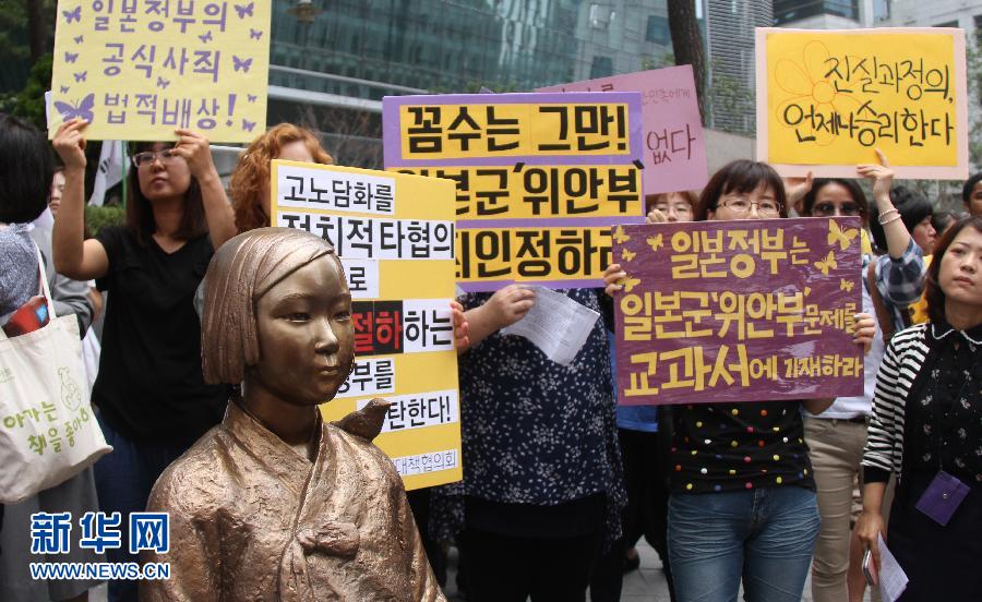 韓國?ソウルの日本大使館前で2日、民衆(zhòng)が慰安婦少女像のそばでプラカードを手に抗議活動(dòng)を行った。新華網(wǎng)が伝えた。