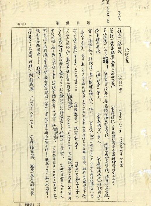 日本人戦犯?藤田茂の1954年8月の供述書(shū)によると、藤田は1889年に日本の広島県に生まれ、1938年8月に中國(guó)山西省で中國(guó)侵略戦爭(zhēng)に參加し、陸軍騎兵第28連隊(duì)大佐連隊(duì)長(zhǎng)に任じられた。後に1945年3月には第43軍第59師団中將師団長(zhǎng)に任じられた。同年8月、朝鮮咸興で捕虜となった。