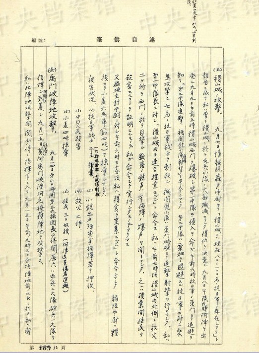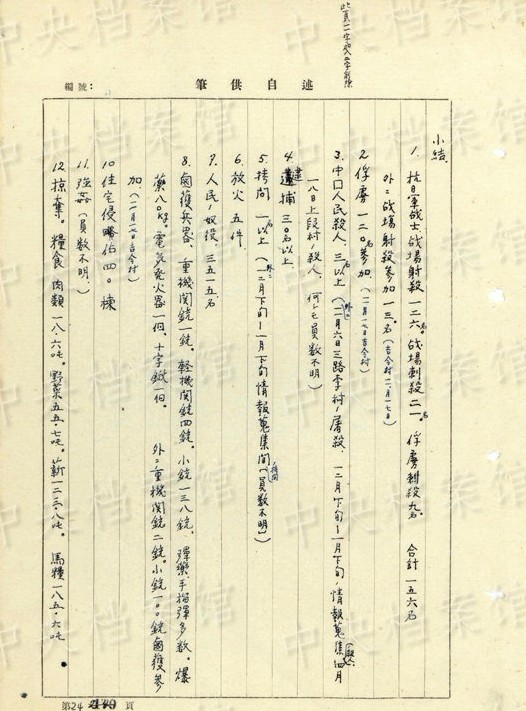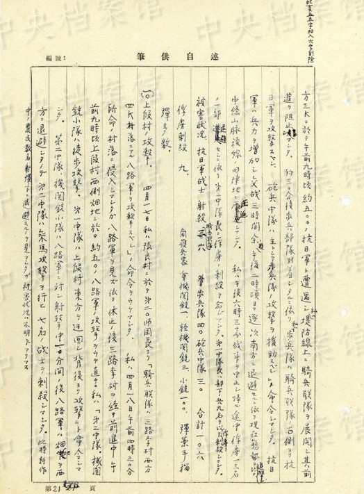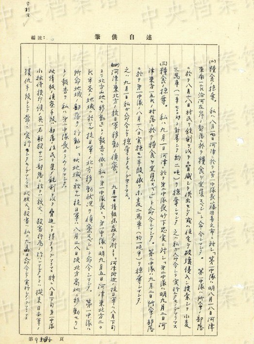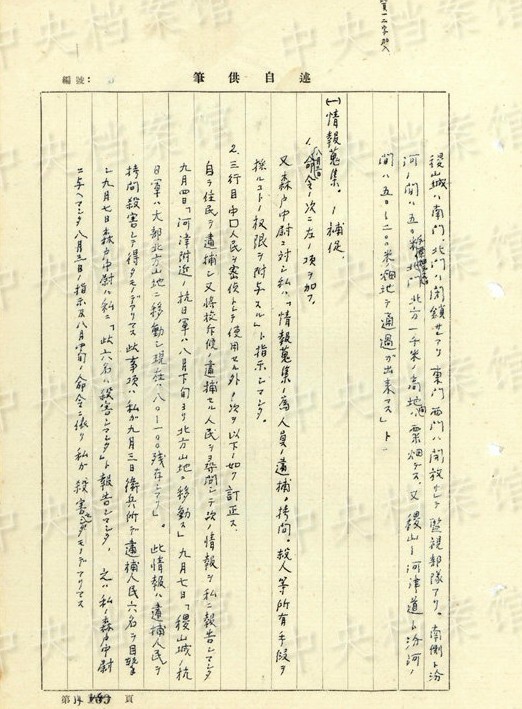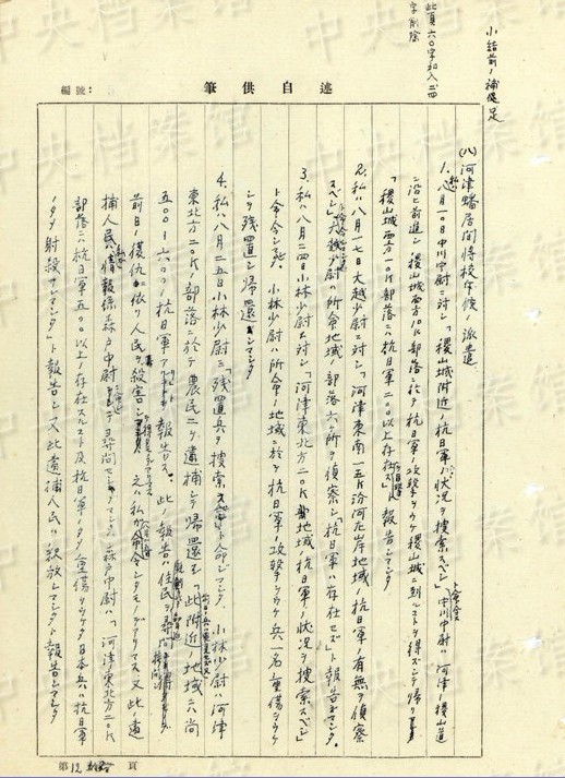 「終戦後ノ処置。(1945年)八月十七日各大隊(duì)長(zhǎng)ヲ集メテ次ノ如ク命令シマシタ。1、機(jī)密、秘密書(shū)類(lèi)ハ焼卻スベシ(日本帝國(guó)主義ノ罪行消滅、共産黨軍弾圧ノ証拠煙滅) 2、特種弾ヲ埋沒(méi)スベシ(瓦斯弾、焼夷弾、発煙弾、曳火弾、及信管ノ一部) 3、防毒面ヲ焼卻スベシ」(編集MA)