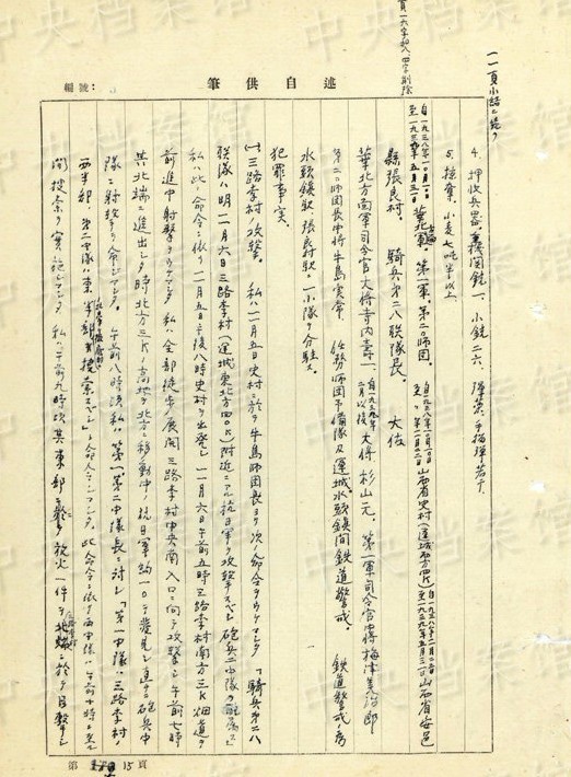 1945年6月には、「済南ニ於ケル俘虜虐殺」が行われ、「陣地構(gòu)築ニ使用シタル済南俘虜収容所ノ俘虜六〇〇名以上ヲ六月一五日以後ニ於テ教育ニ使用シ刺殺セシメマシタ」。