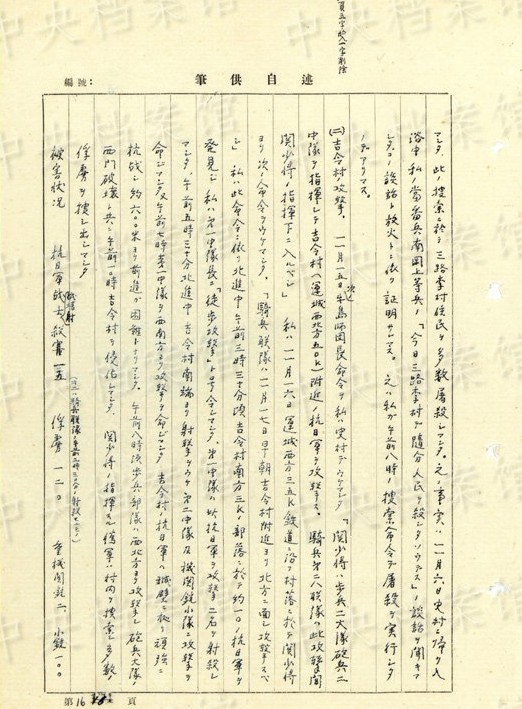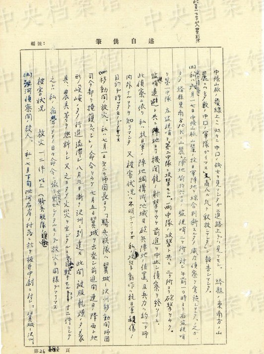 1945年3月27日、「竹林橋北方200米ノ鄧県―老河口道上約五十戸ノ部落ニ於テ住民ノ凡テ老人、婦人、子供迄モ之ヲ數(shù)ヶ所ニ集メ(中略)屠殺シマシタ」。同日には、「馬屈山攻撃ニ於ケル瓦斯弾ノ使用」もあった。