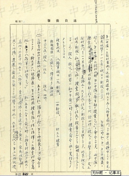 1939年4月、夏県では、「第一中隊(duì)長(zhǎng)ニ俘虜ノ刺殺ヲ命ジマシタ」「第一中隊(duì)長(zhǎng)ハ部下ノ兵九名ヲ以テ俘虜ヲ刺殺シマシタ」。
