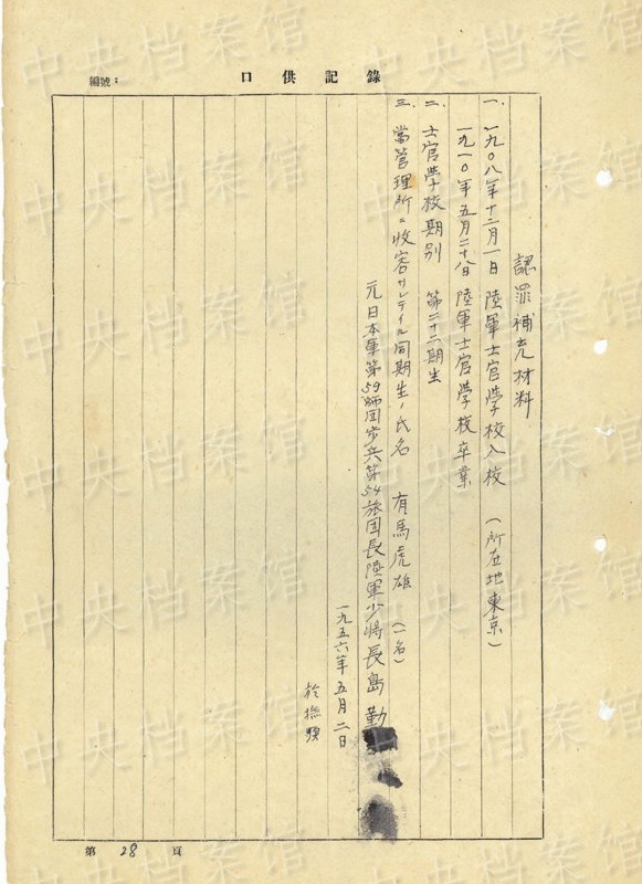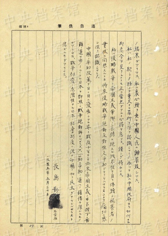 國(guó)家公文書局のウェブサイトでこのほど、日本人戦犯?長(zhǎng)島勤の中國(guó)侵略犯罪の供述書が発表された。これによると、1942年4月から1945年7月までに、長(zhǎng)島は、「大小一五回ノ作戦討伐ヲ行ヒ殺害抗日軍人一六六〇名、平和人民九七〇名」「民房二二二〇間以上ヲ焼卻破壊シ、抗日軍人九七〇名、平和人民二五〇名ヲ逮捕シ、糧食六〇〇〇噸ヲシマシタ。強(qiáng)制労役12萬工日ヲ酷使シマシタ」という。