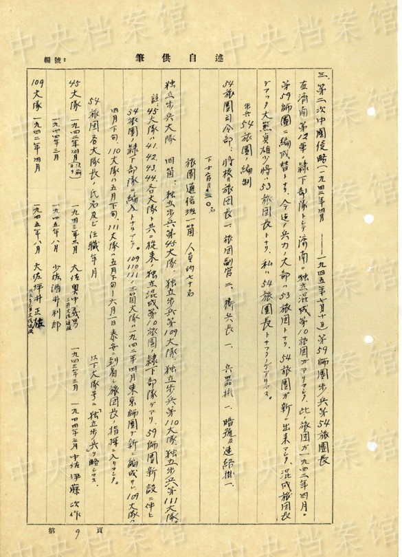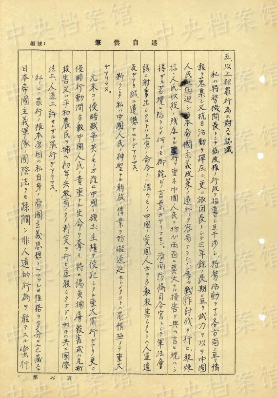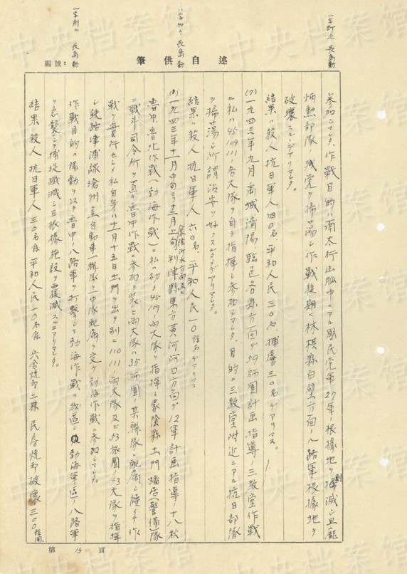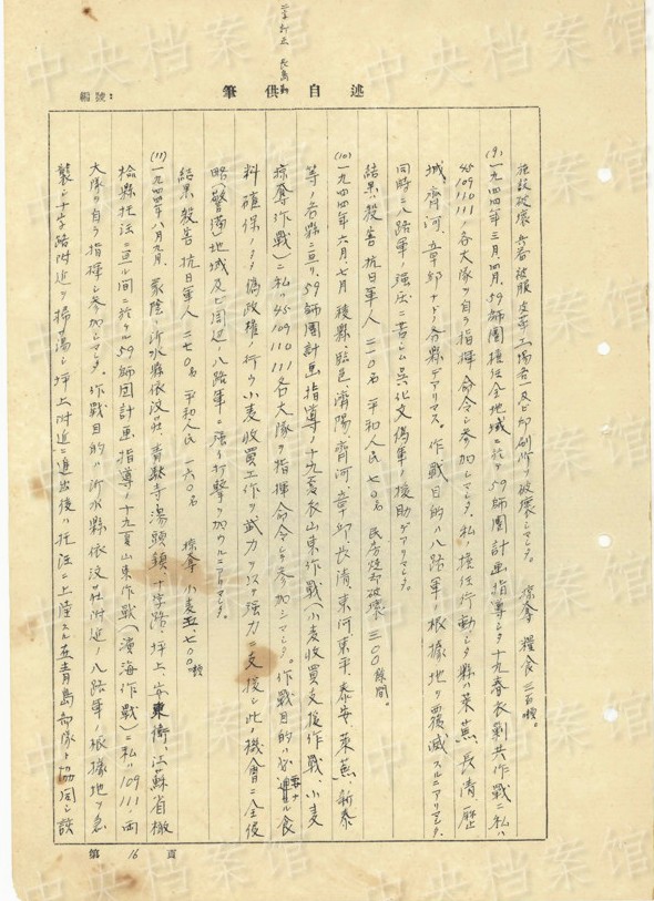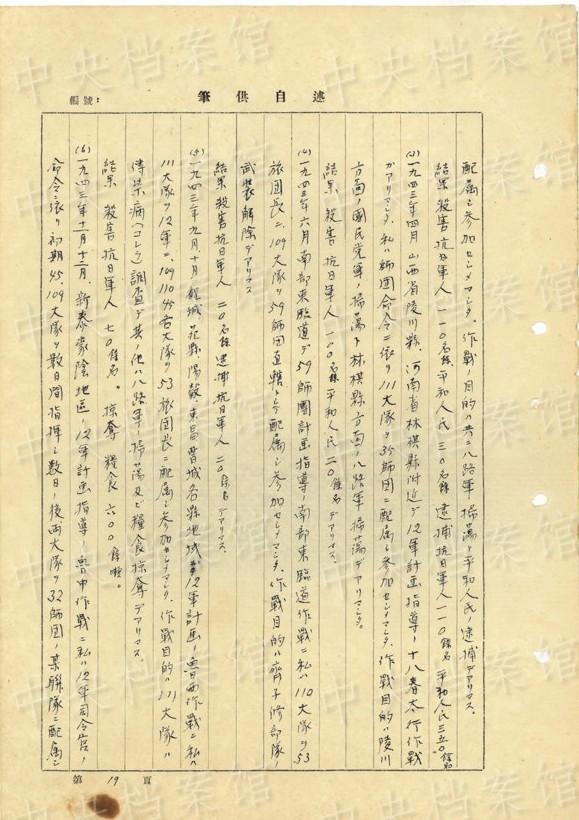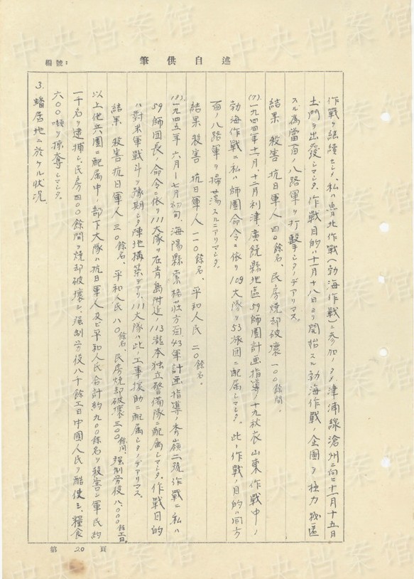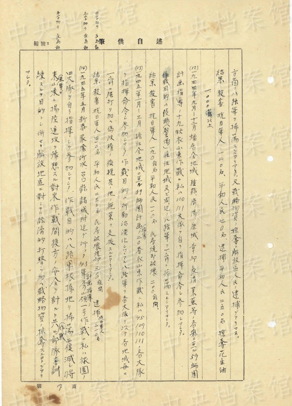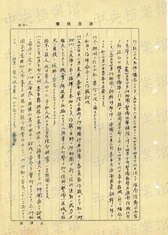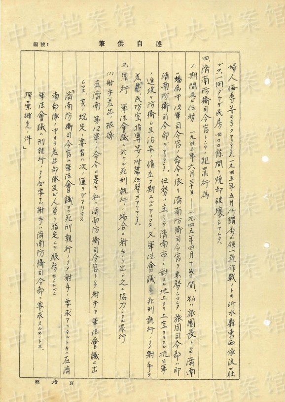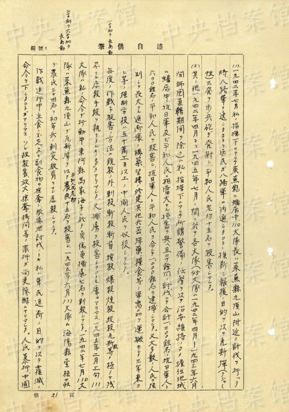 「一九四五年二月上旬、111大隊(duì)ハ私ノ命令デ行動(dòng)中、東阿県馬家海子ニ於テ負(fù)傷員捕虜七名ヲ刺殺シマシタ。一九四二年七月、110大隊(duì)ハ萊蕪県九頂山デ瓦斯弾ヲ以テ平和人民老少十五名ヲ殺害(中略)シマシタ」。(編集MA)