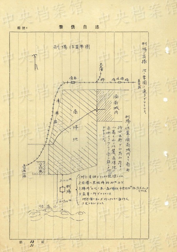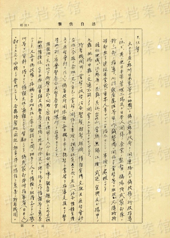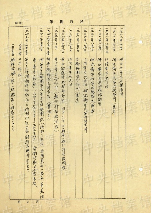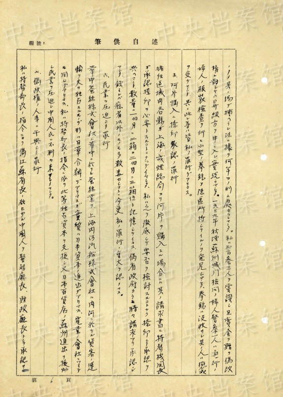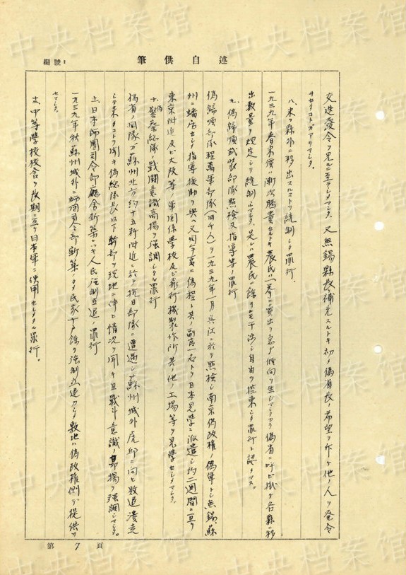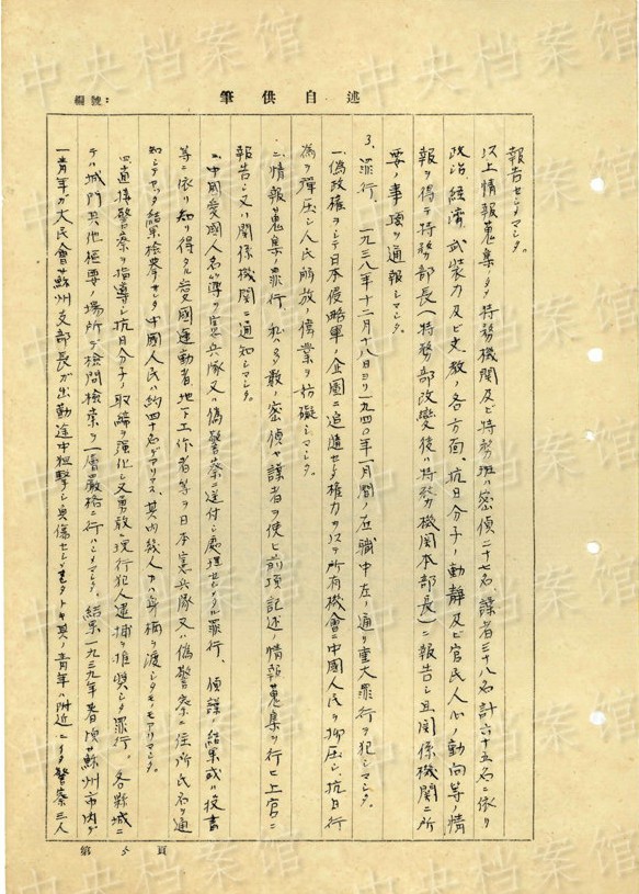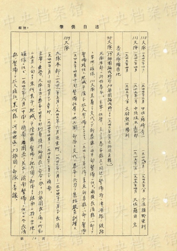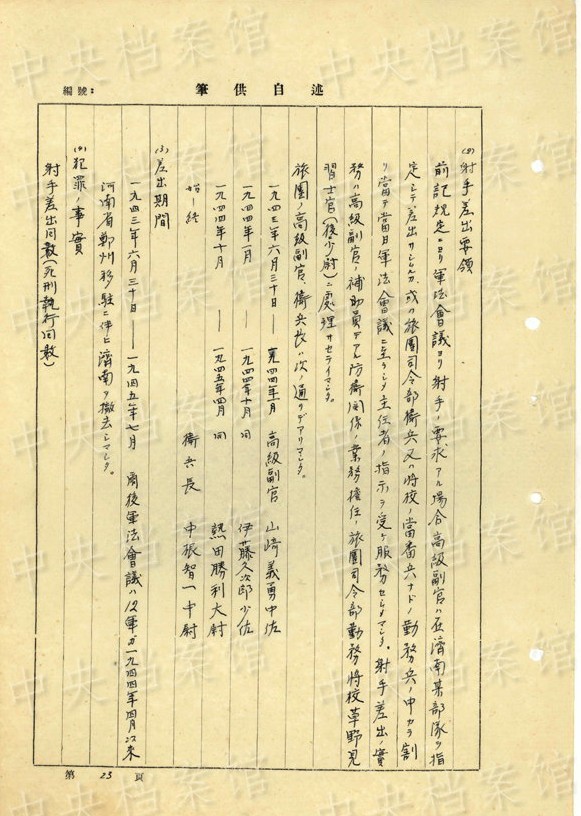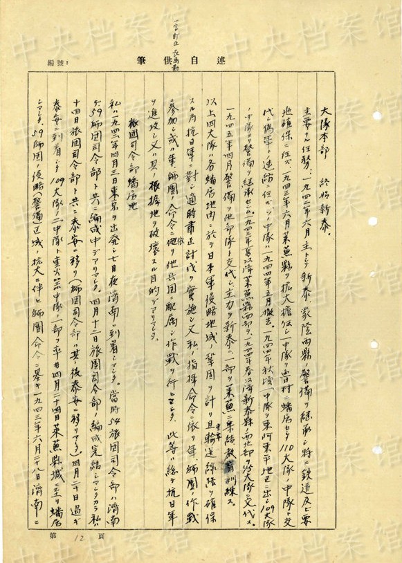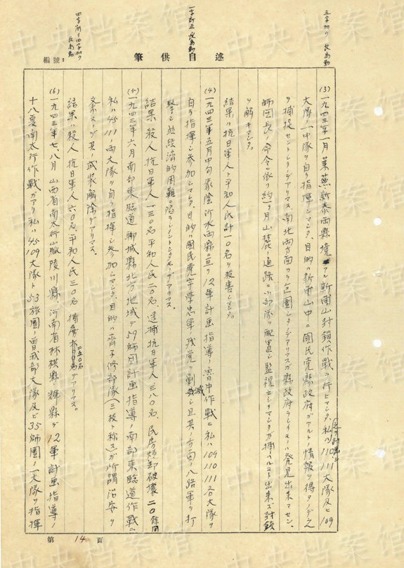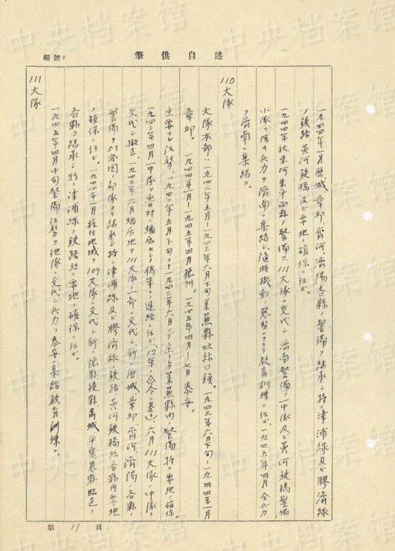 「一九四五年二月上旬、111大隊(duì)ハ私ノ命令デ行動(dòng)中、東阿県馬家海子ニ於テ負(fù)傷員捕虜七名ヲ刺殺シマシタ。一九四二年七月、110大隊(duì)ハ萊蕪県九頂山デ瓦斯弾ヲ以テ平和人民老少十五名ヲ殺害(中略)シマシタ」。(編集MA)