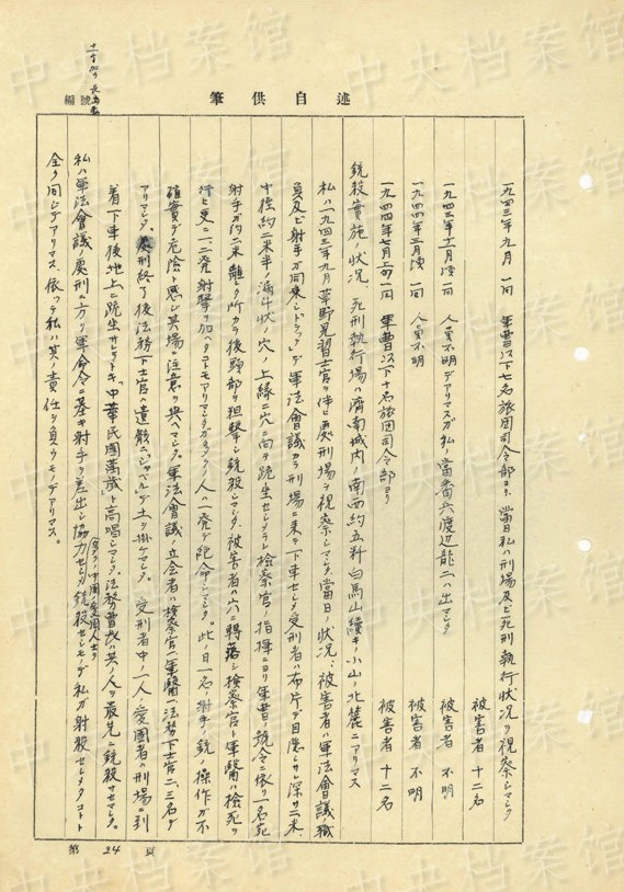 「毎度ノ作戦ニテ殺害ノ方法ハ銃殺ノ外、刺殺、斬殺、斬首、爆殺、焼殺、絞殺、瓦斯殺等ノ極メテ殘忍ナル虐殺手段ヲ執(zhí)リタルモノ多クアリマシタ。又捕虜ヲ殺害シタコトモ屢々アリマス」。