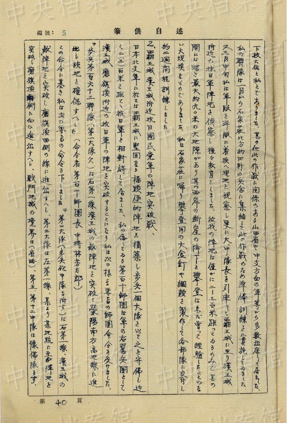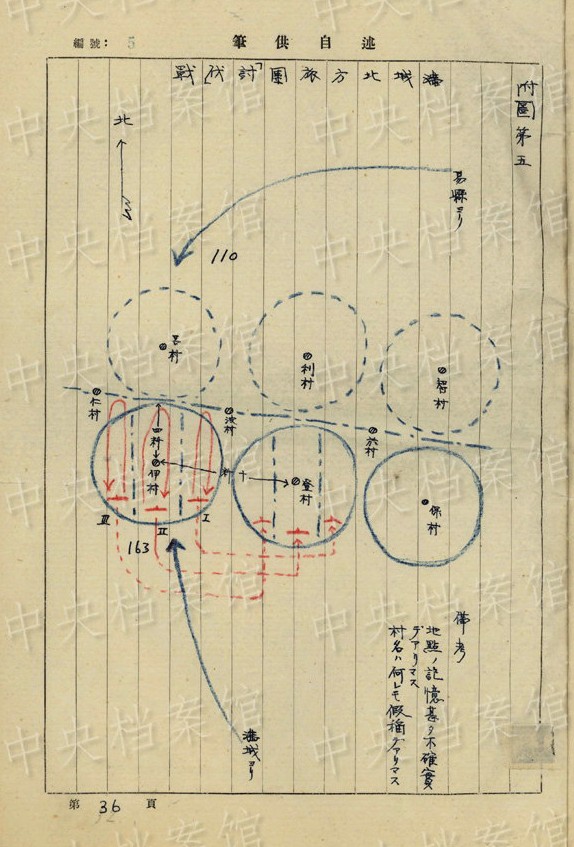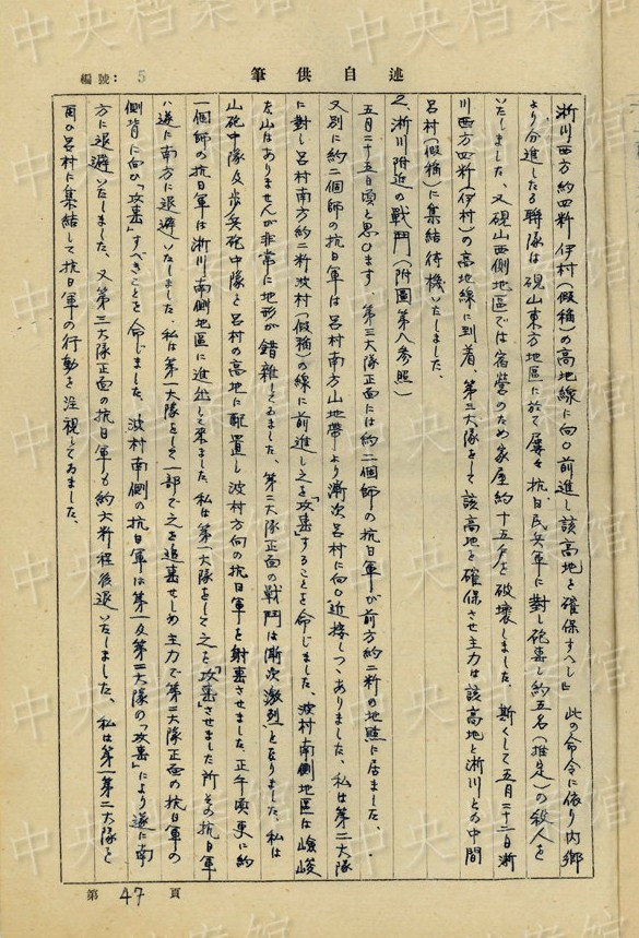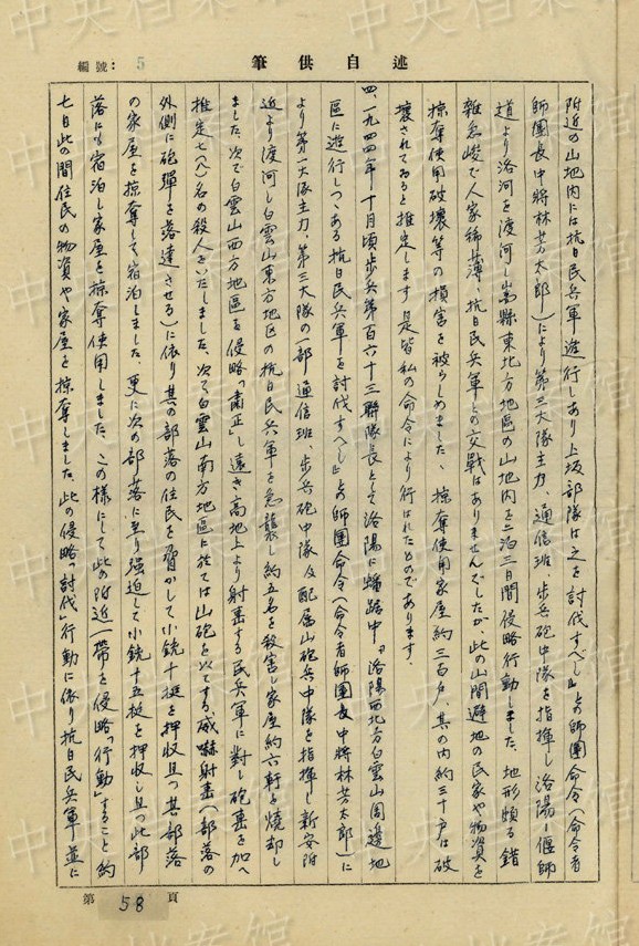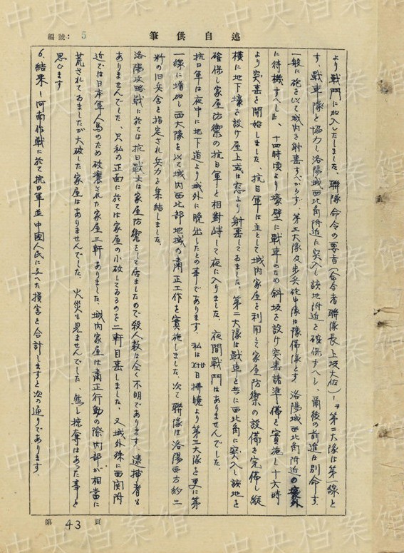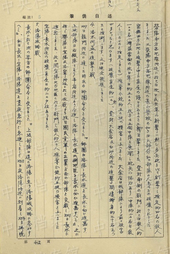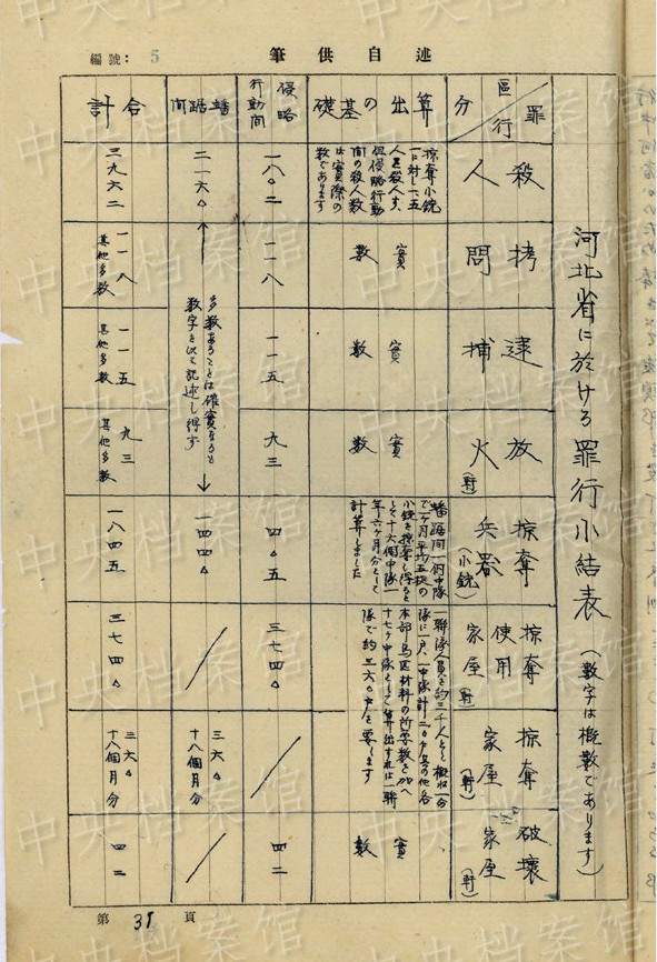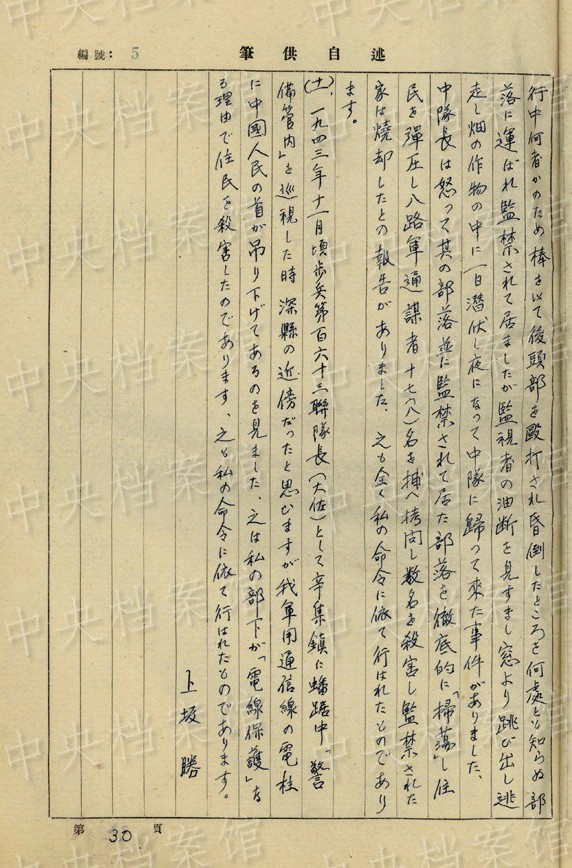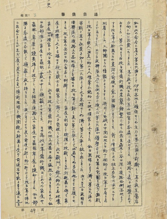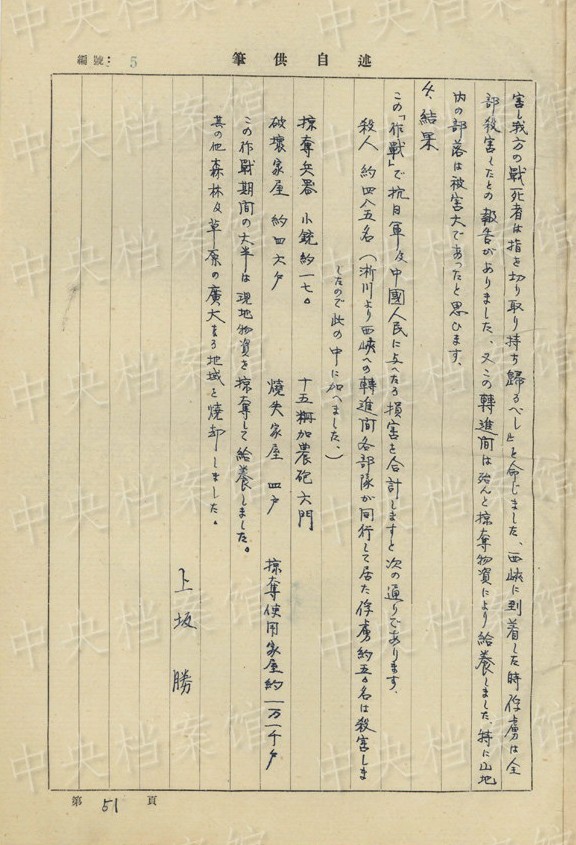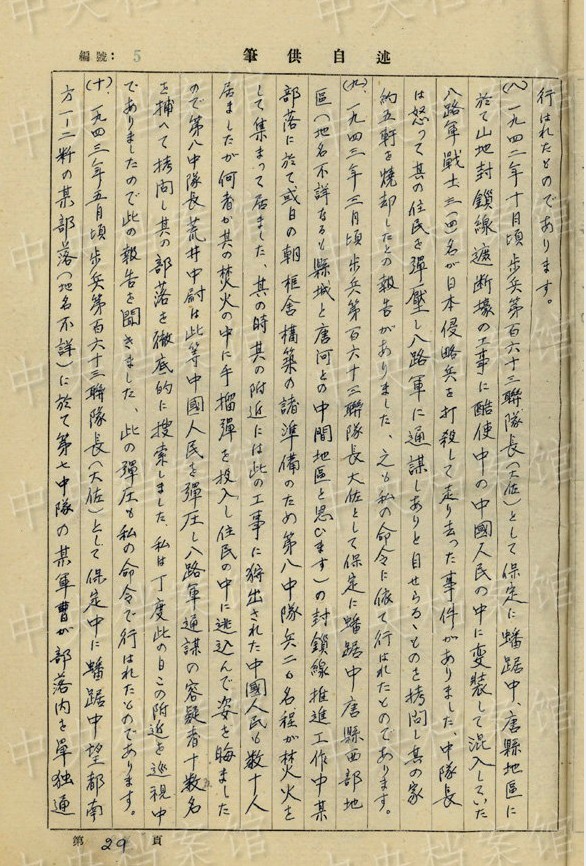 1942年5月27日、冀中作戦で「私は此の戰(zhàn)鬥に於て第一大隊(duì)をして八路軍及住民を殺害すること約八百人に上り」、「赤筒及緑筒の毒瓦斯を使用し機(jī)関銃の掃射と相俟って八路軍戰(zhàn)士のみならず逃げ迷ふ住民をも射殺しました、又部落內(nèi)を『掃蕩』し多數(shù)の住民が遁入せる地下壕內(nèi)に毒瓦斯赤筒、緑筒を投入して窒息せしめ或は苦痛のため飛び出す住民を射殺し刺殺し斬殺する等の殘虐行為をいたしました」?!复摔吻致宰鲬?zhàn)に於て聯(lián)隊(duì)が中國人民に與えた損害は殺人約一千一百名に及び家屋の破壊約十軒、焼失家屋約三軒、掠奪使用家屋約四五〇軒(約十日間)其の他中國人民約二四〇名を框舎構(gòu)築(八個(gè))のため酷使しました(約十日間)」。