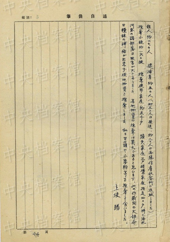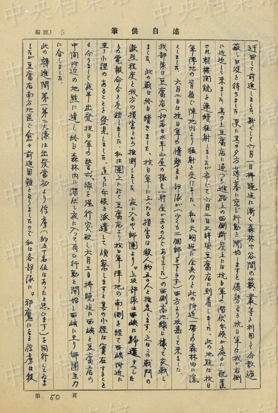 1945年6月、「此の轉(zhuǎn)進(jìn)間第一第二大隊(duì)は出發(fā)當(dāng)初より俘虜(約五十名位はあったと思ひます)を同行してゐましたが豆腐店南方地區(qū)で愈々前進(jìn)困難となりましたので私は各部隊(duì)に『邪魔になる俘虜は殺害し我方の戦死者は指を切り取り持ち歸るべし』と命じました」「俘虜は全部殺害したとの報(bào)告がありました」。(編集NA)