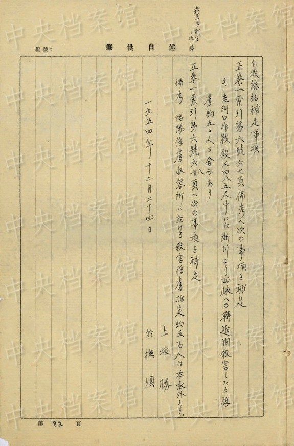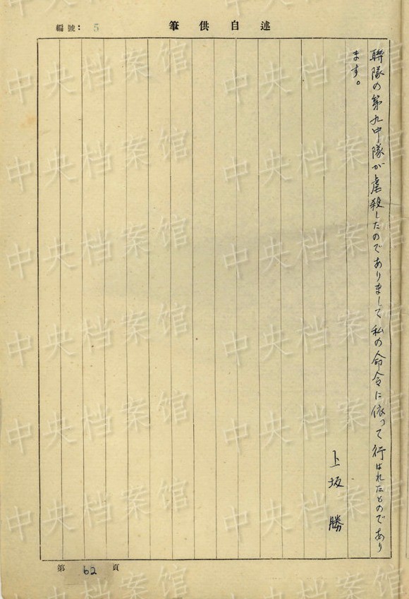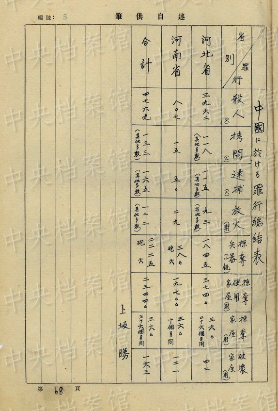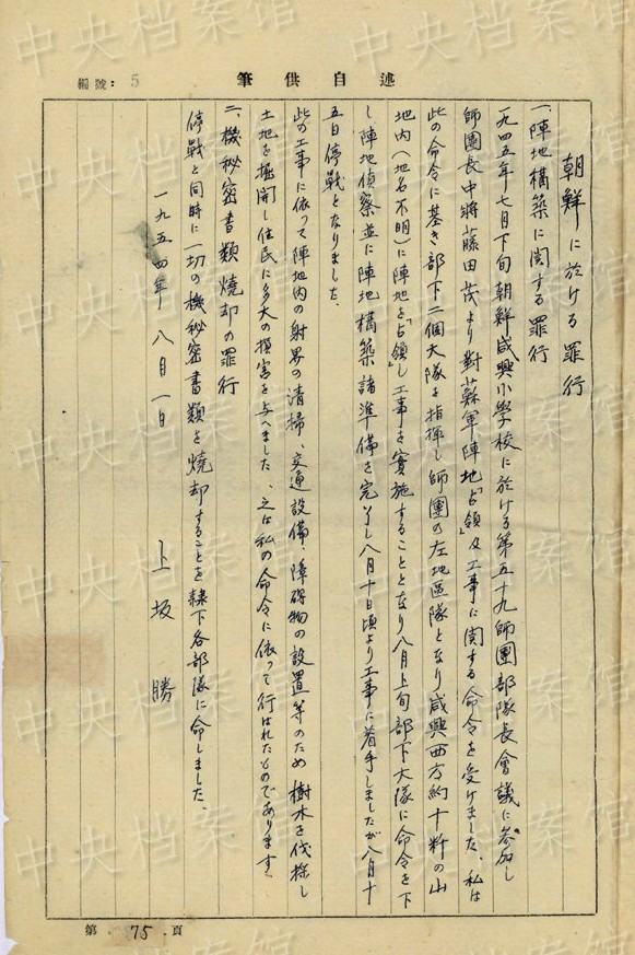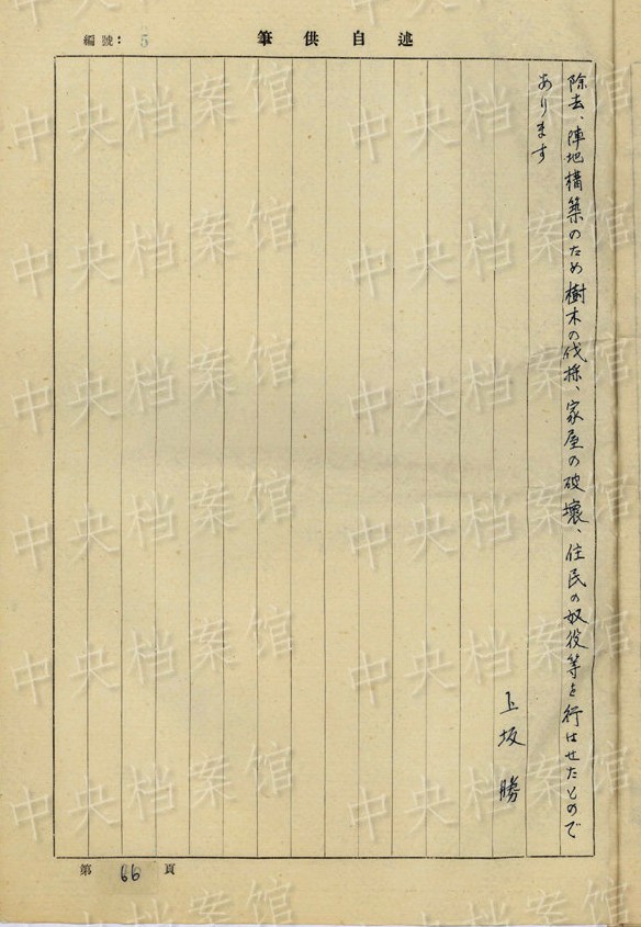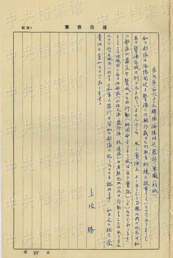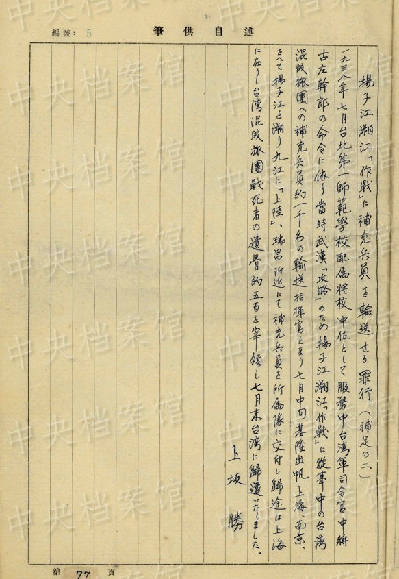 上坂勝の1954年7月の供述書によると、上坂は1892年大分県生まれ。1934年3月~1941年11月、臺灣で歩兵連隊の副隊長、大隊長を務(wù)め、階級は少佐、中佐。1945年6月に陸軍第五十九師団歩兵第五十三旅団長に任じられた。同年8月20日、朝鮮?咸興付近でソ連軍の俘虜となった。